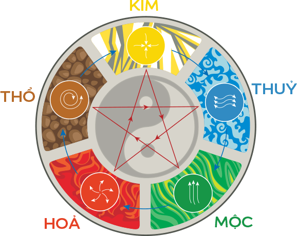 - Quan hệ tương sinh: Mộc sinh Hỏa => Hỏa sinh Thổ => Thổ sinh Kim => Kim sinh Thủy => Thủy sinh Mộc